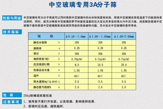 中空玻璃通用型分子篩可以同時(shí)吸附中空玻璃中的水分和殘留有機(jī)物,使中空玻璃即使在很低溫度下仍然保持光潔透明,同時(shí),能充分降低中空玻璃因季節(jié)和晝夜溫差巨大變化所承受的強(qiáng)大內(nèi)外壓力差,徹底解決普通中空玻璃干燥劑易使中空玻璃膨脹或收縮而導(dǎo)致的扭曲破碎問題,充分延長(zhǎng)中空玻璃的使用壽命。